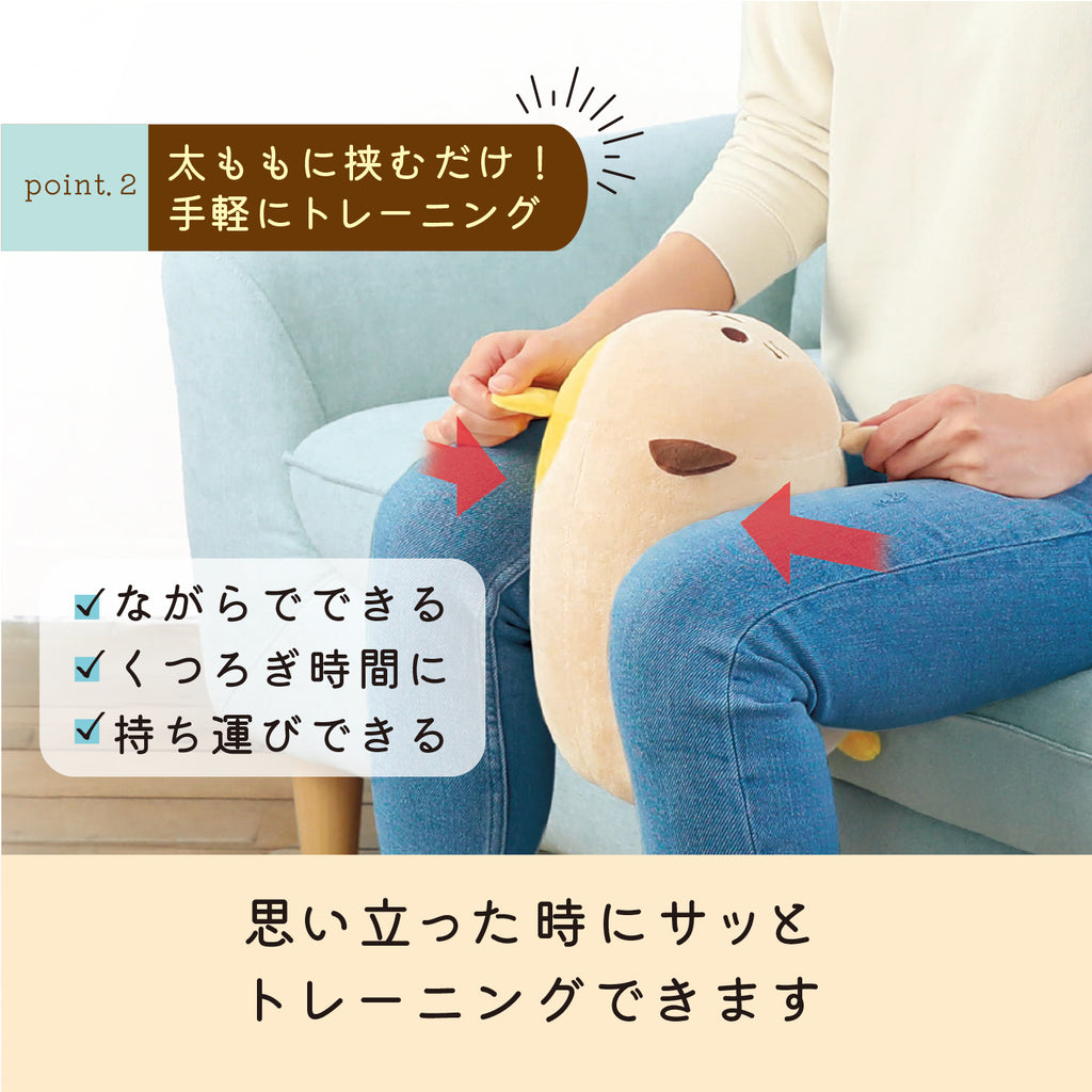 かわいいぬいぐるみなのに本格仕様で、太ももトレーニングなど下半身の引き締め、骨盤底筋強化、尿もれ対策など、毎日手軽に取り入れられる“ながらトレーニング”アイテムです。