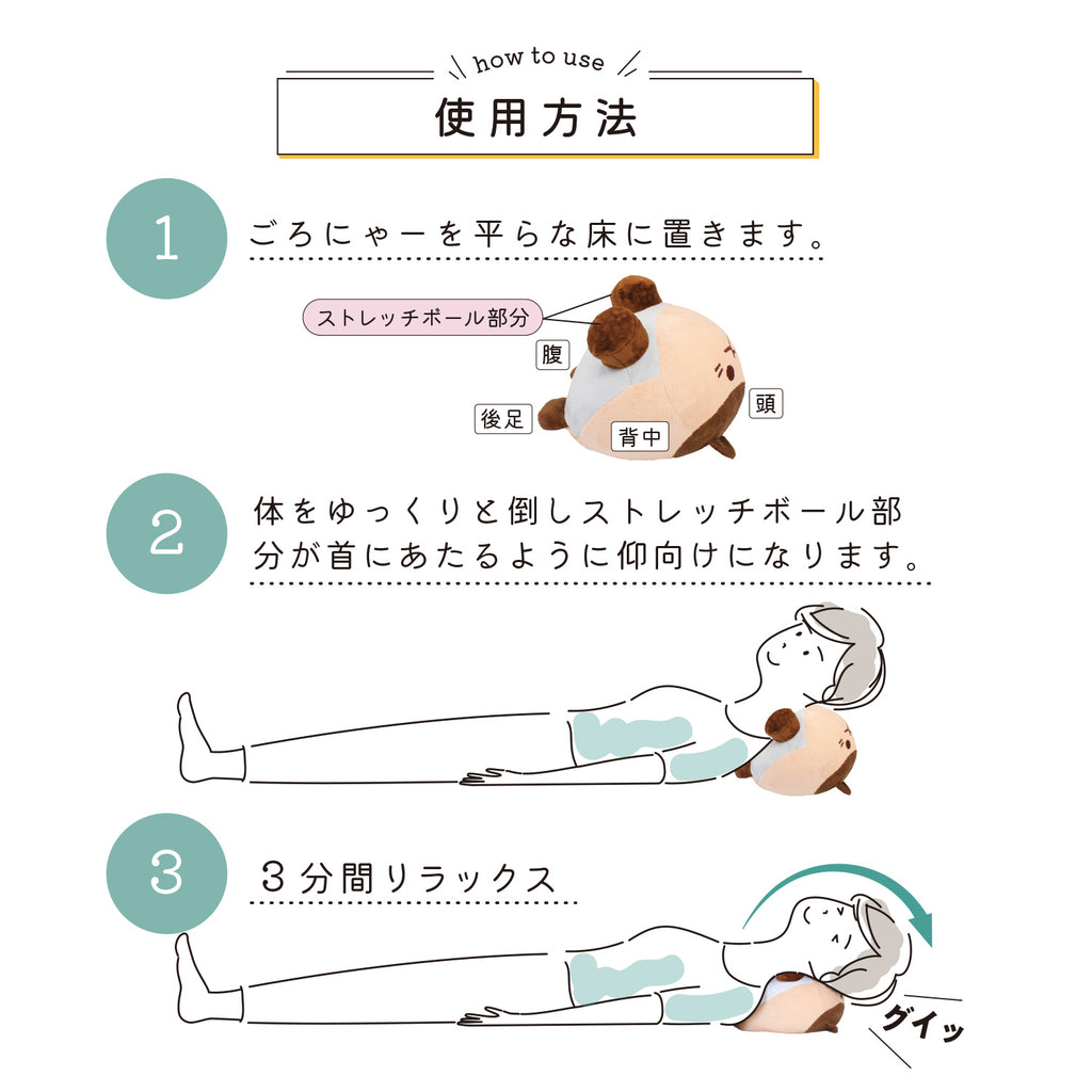 首の自然なカーブに沿うアーチ形状と、弾力のあるモチモチ素材が特長。頭を預けると、やさしく支えながら首まわりを心地よくストレッチすることができます。前足部分には凹凸のある硬質素材を内蔵し、まるで猫が前足でぐいっと押してくれるような使用感も。寝転ぶだけの簡単ステップで、首や肩の緊張をゆるめるサポートになります。