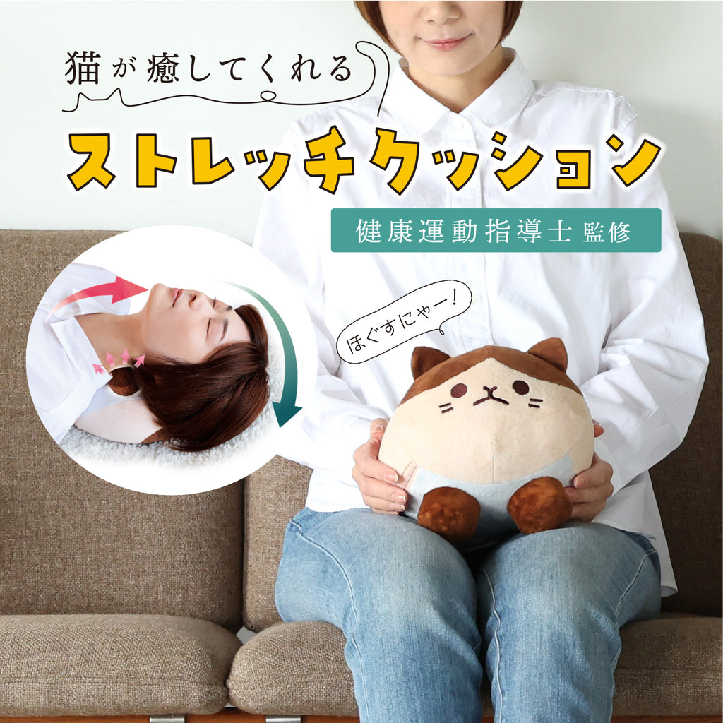「にゃんトレストレッチ ごろにゃー」は、寝転んで頭をのせるだけで硬い首まわりをほぐす猫型のストレッチクッション。スマホやパソコン作業による首・肩のこわばり、ストレートネック、スマホ首などが気になる方にぴったりのアイテムです。
